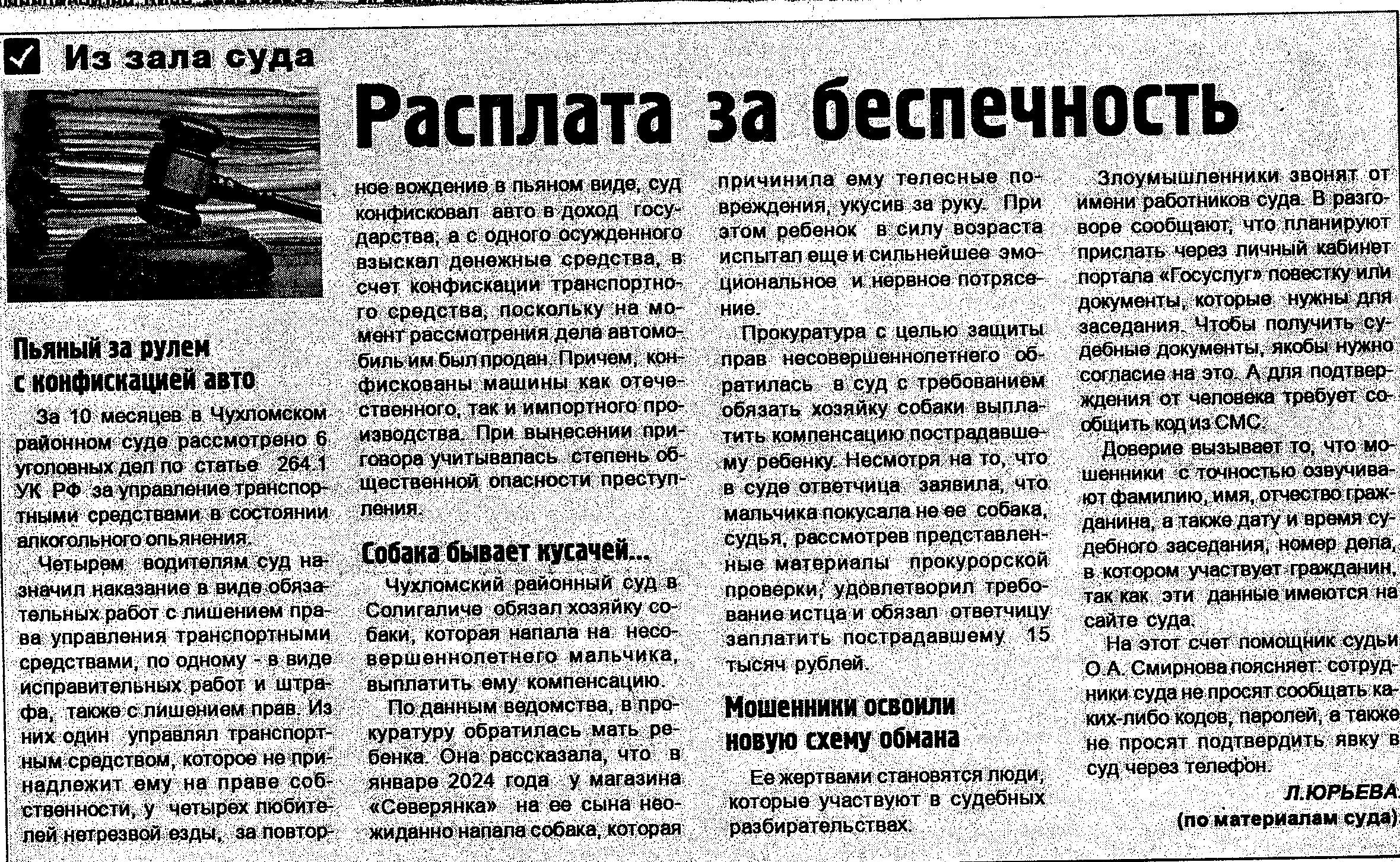 | Статья в районной газете "Солигаличские вести" - "Расплата за беспечность"" | версия для печати |