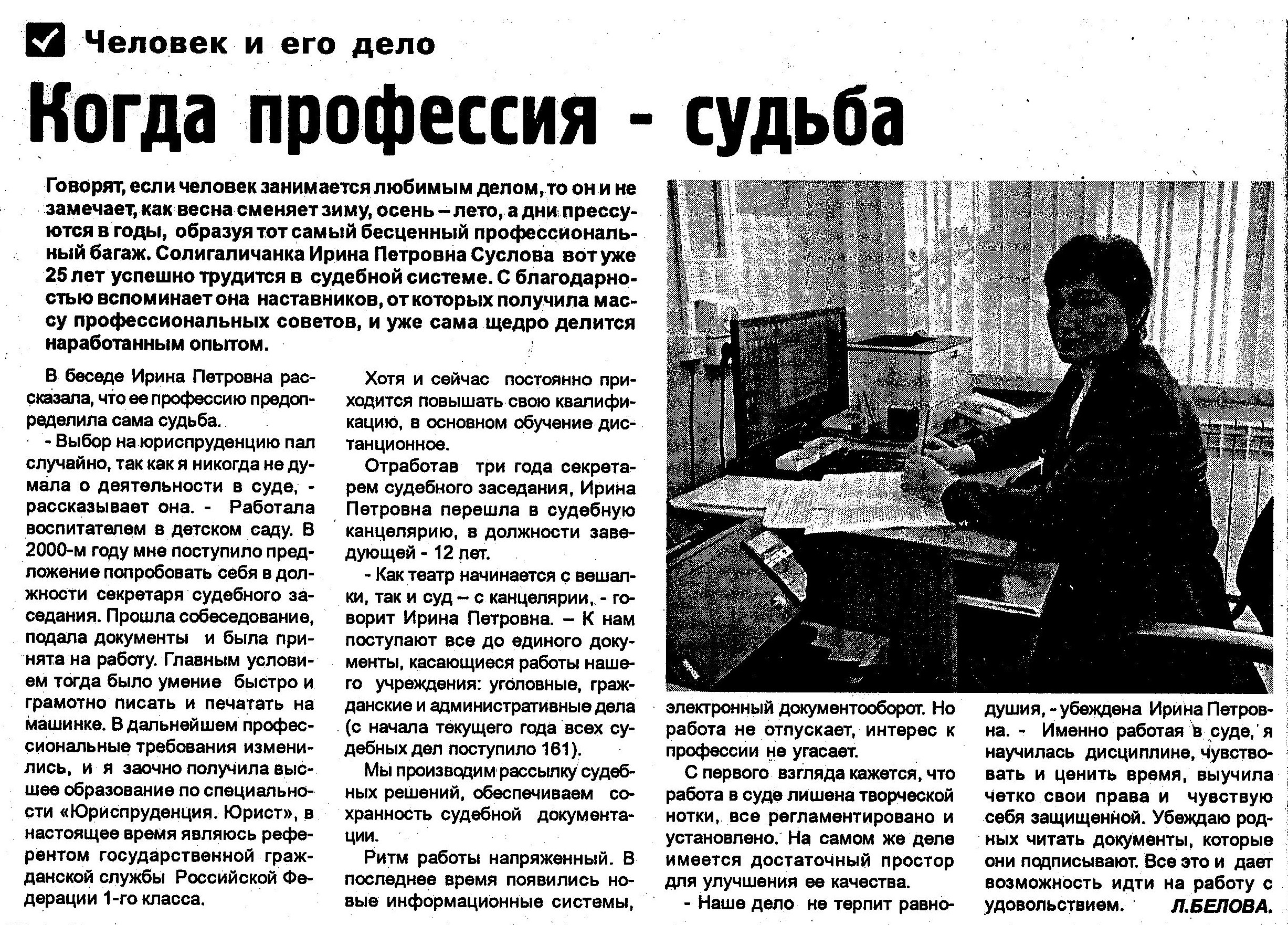 | Статья в районной газете "Солигаличские вести" - "Когда профессия - судьба" | версия для печати |