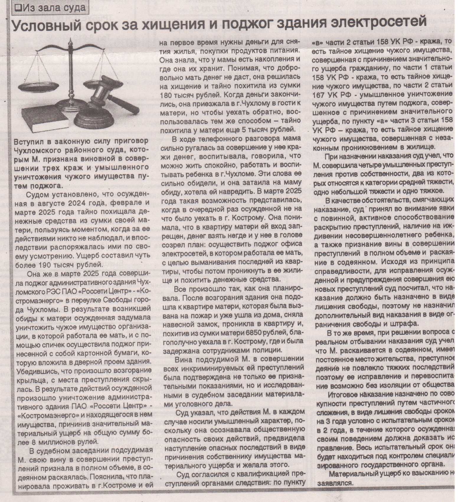 | Статья в районной газете "Вперед" - ""Условный срок за хищение и поджог здания электросетей" | версия для печати |