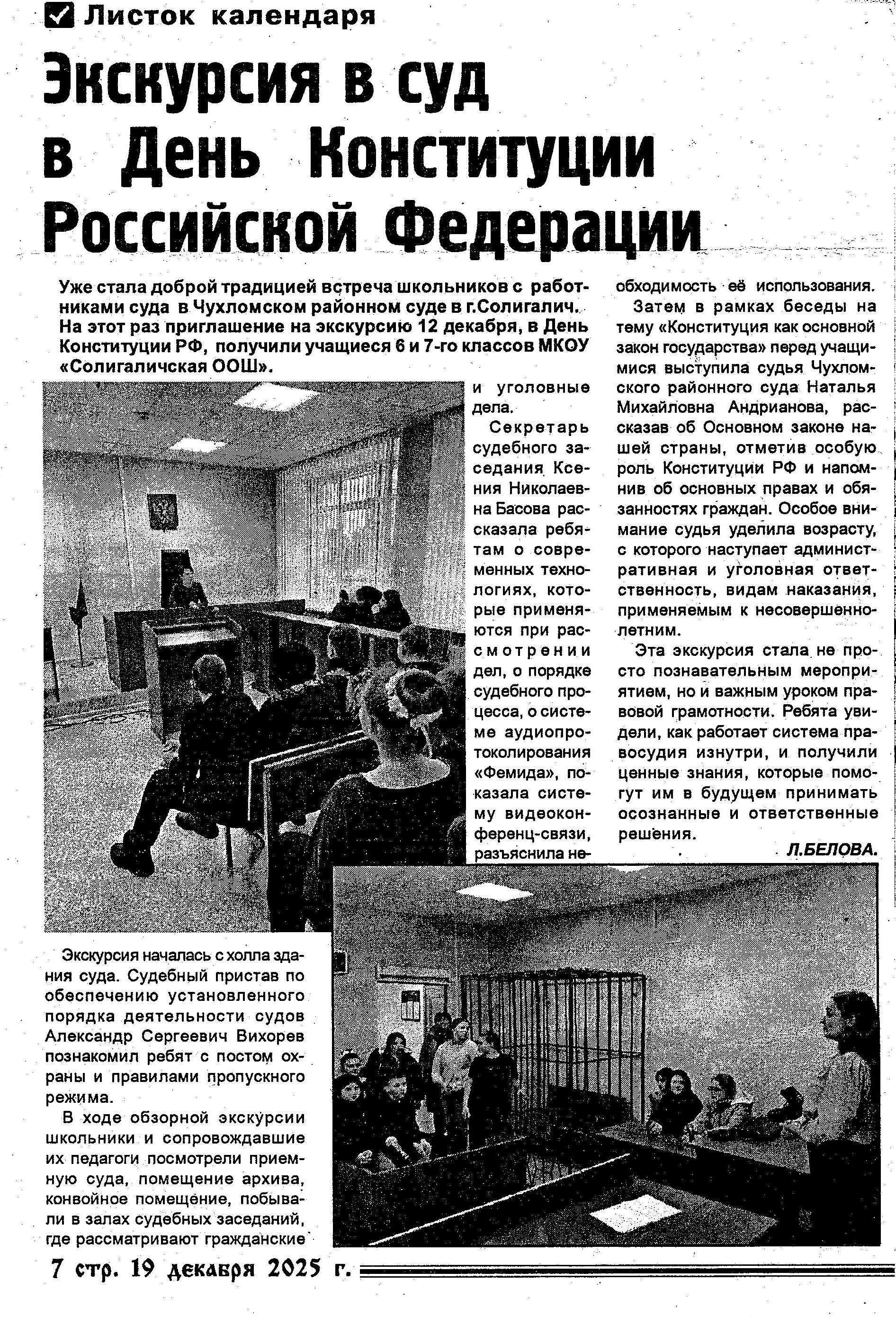 | Статья в районной газете "Солигаличские вести" - "Экскурсия в суд в День Конституции Российской Федерации" | версия для печати |