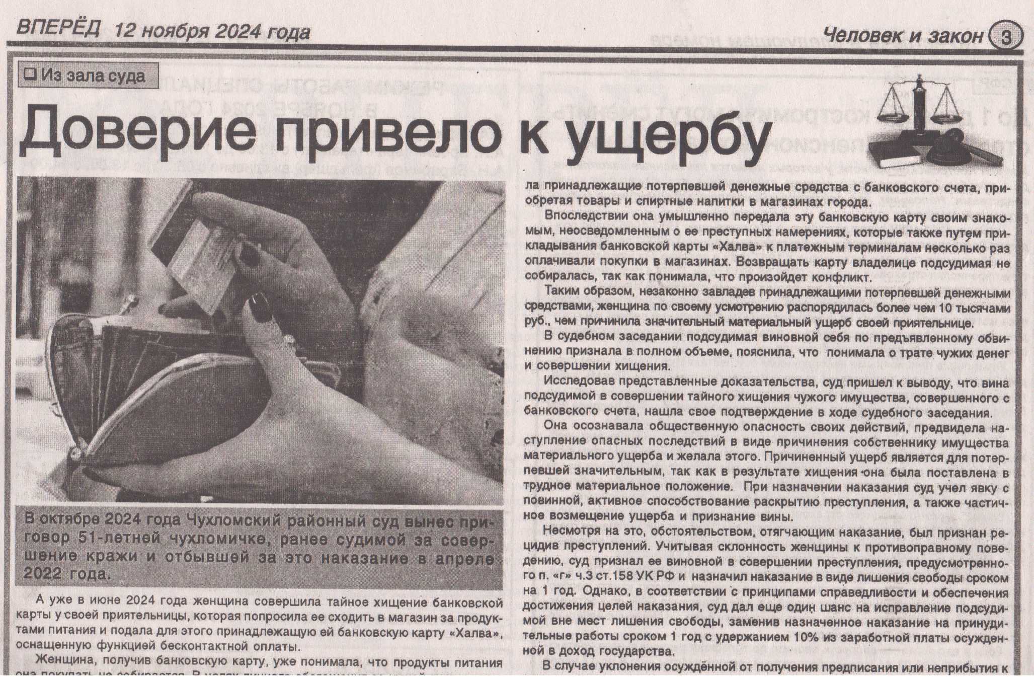 | Статья в районной газете "Вперед" - "Доверие привело к ущербу" | версия для печати |