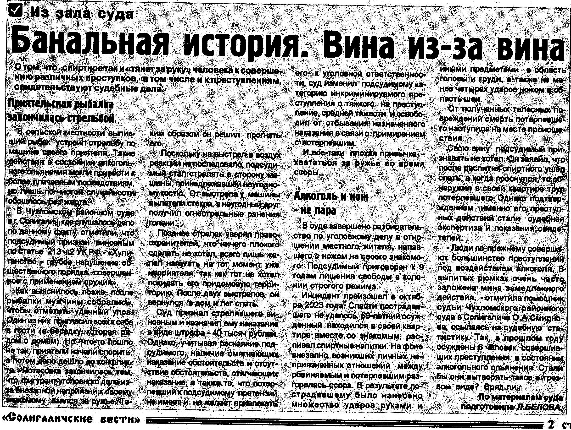 | Статья в районной газете "Солигаличские вести" - "Банальная история. Вина из-за вина" | версия для печати |