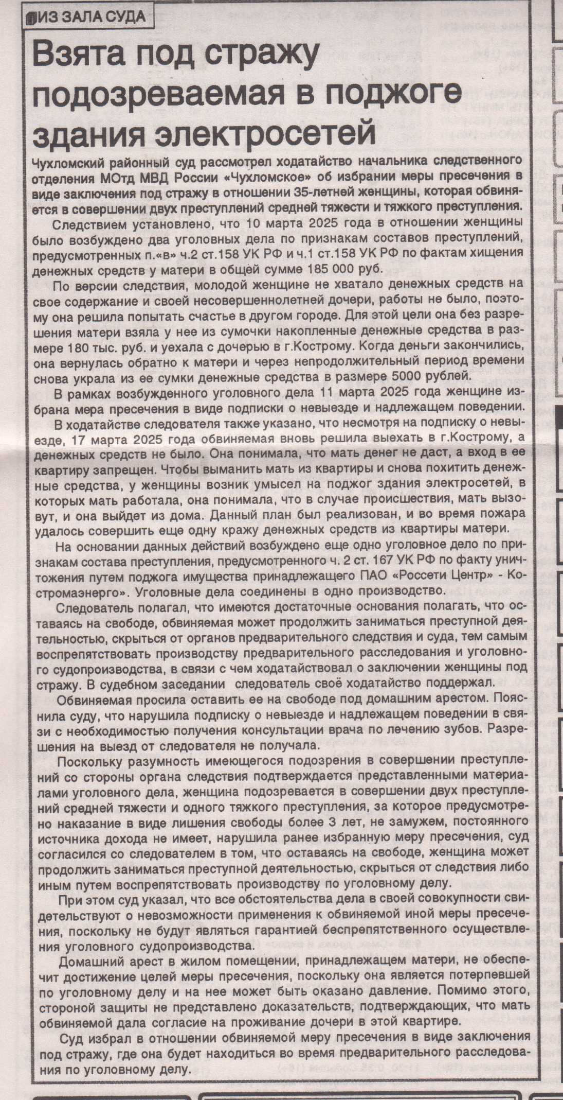 | Статья в районной газете "Вперед" - "Взята под стражу подозреваемая в поджоге здания электросетей" | версия для печати |
