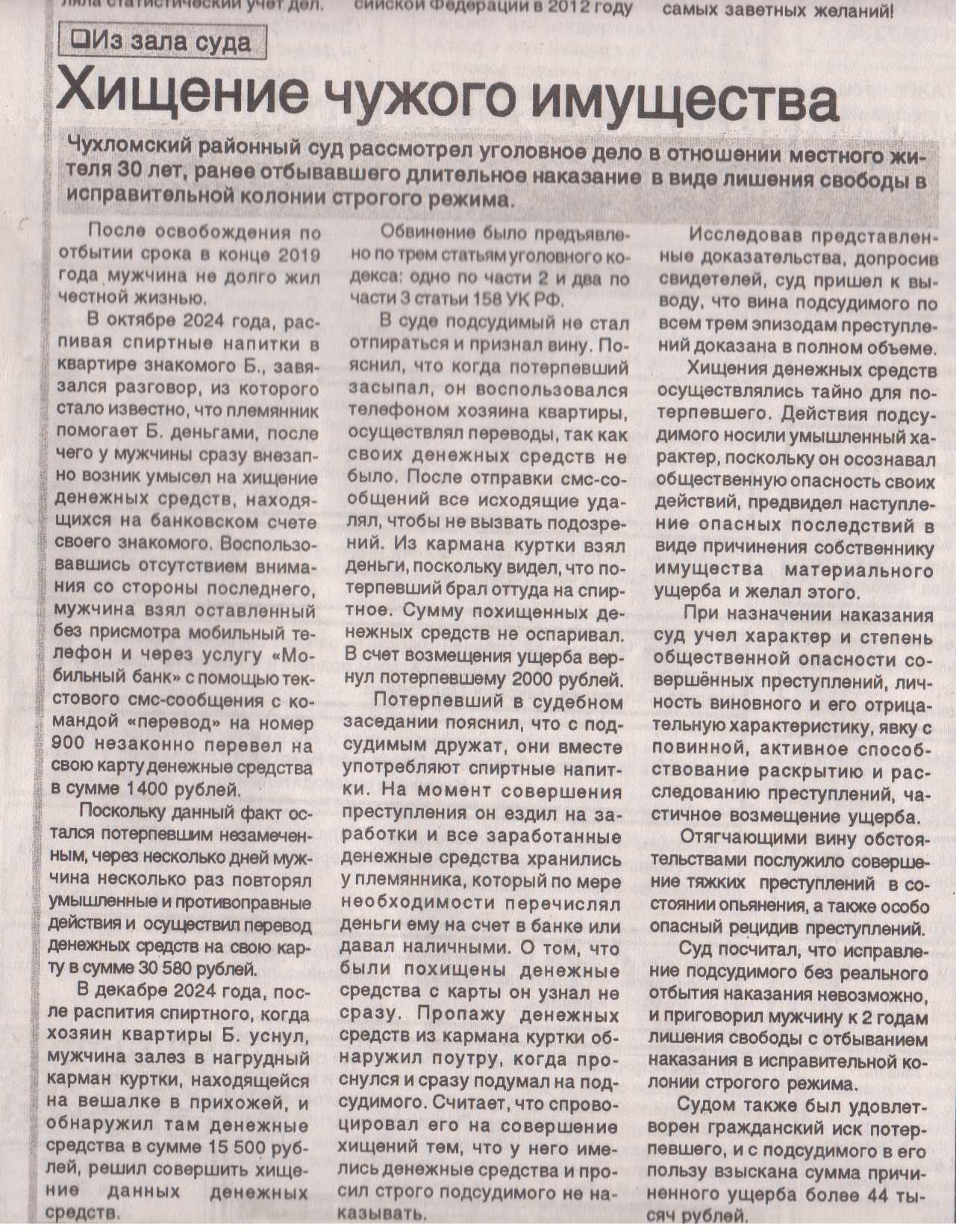 | Статья в районной газете "Вперед" - "Хищение чужого имущества" | версия для печати |