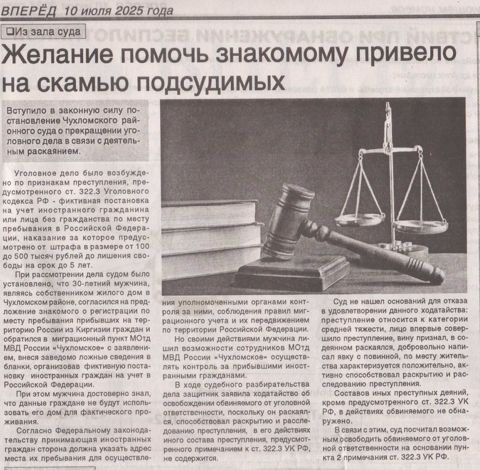 | Статья в районной газете "Вперед" - "Желание помочь знакомому привело на скамью подсдуимых " | версия для печати |