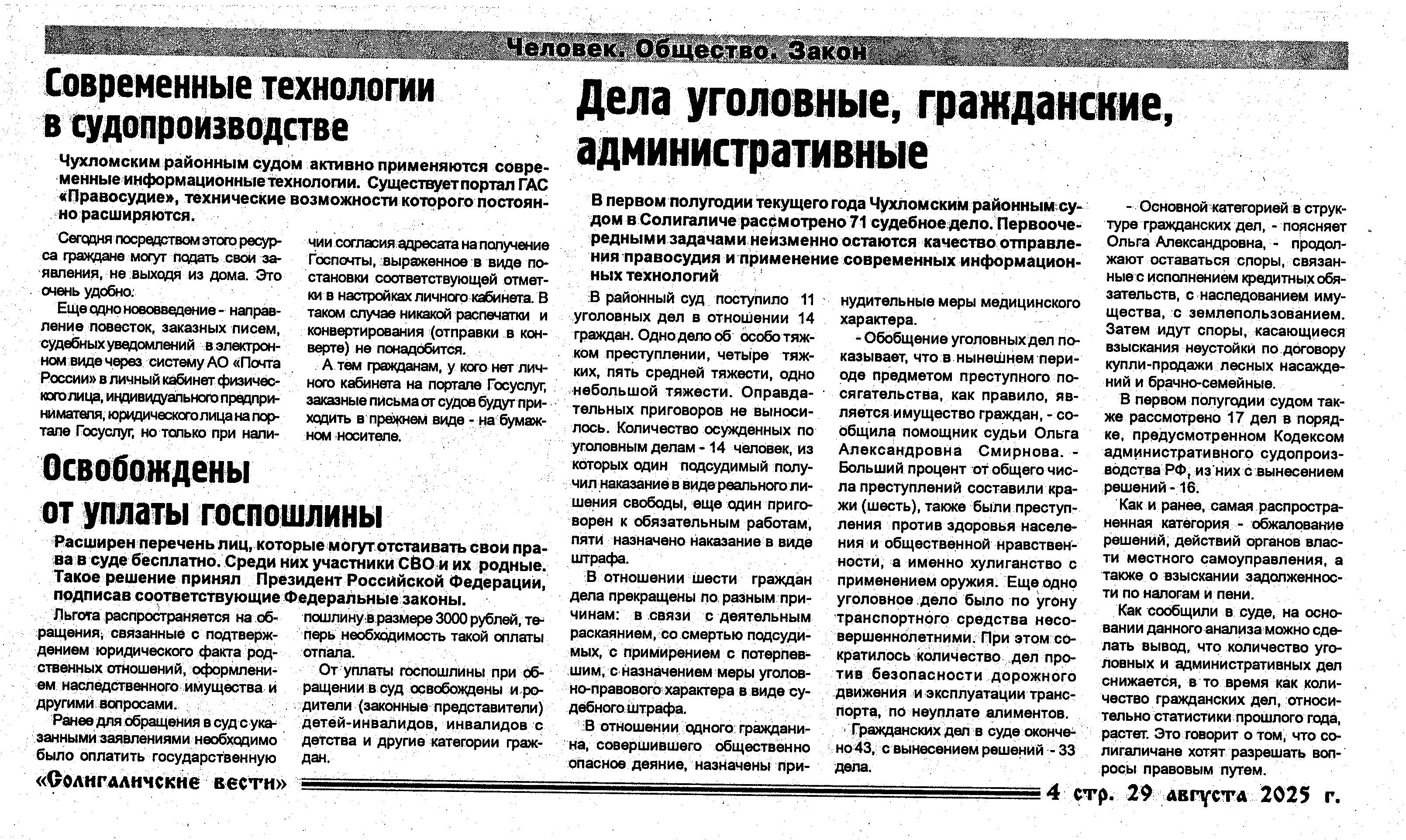 | Статья в районной газете "Солигаличские вести" - "Дела уголовные, гражданские, административные" | версия для печати |